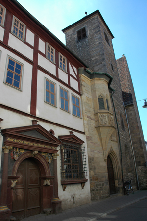 | Der Turm wurde Mitte des 14. Jahrhunderts errichtet und ist der älteste Turm Erfurts. Die Kirche war ehemals eine Brückenkopfkirche und befindet sich in der Altstadt. | |