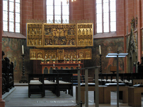| Ein weiteres bedeutsames Stück im Inneren ist der 1434 gestiftete Maria-Schlaf-Altar in der Marienkapelle sowie eine lebensgroße Kreuzigungsgruppe von 1509, das der Steinbildhauer Hans Backoffen aus Mainz geschaffen hat. | |
