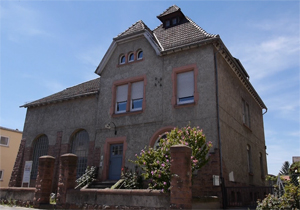 | Links der Kirche gelangt man durch die Schulstraße an der Peter-Schöffer-Grundschule vorbei in den Rosengarten. |