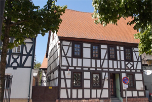 Das zweigeschossig Haus fällt besonders durch seine Fachwerkkonstruktion und dem großen Walmdach auf. Seine Entstehung wird auf das Jahr 1710/15 datiert. |