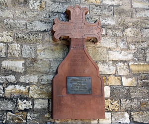 Auf der Rückseite der Michaelskapelle ist das in Sandstein gefertigte Brentanokreuz von 1755 zu erkennen. Es trägt das Geburts- und Todesdatum von Andreas Brentano Bernarda. Er war der Stammvater der seit 1706 in Gernsheim ansässigen Brentanos. |