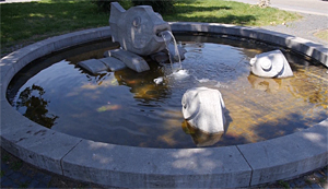 | Vor dem, als Highlight zeitgenössischer Architektur gepriesenen Bauwerk, fällt der Blick zudem auf eine Brunnenanlage, die aus Basaltlavasteinen gefertigt ist. Der Eulenbrunnen versinnbildlicht mit seiner Eule das Wahrzeichen und Fastnachtssymbol der Gernsheimer. | |